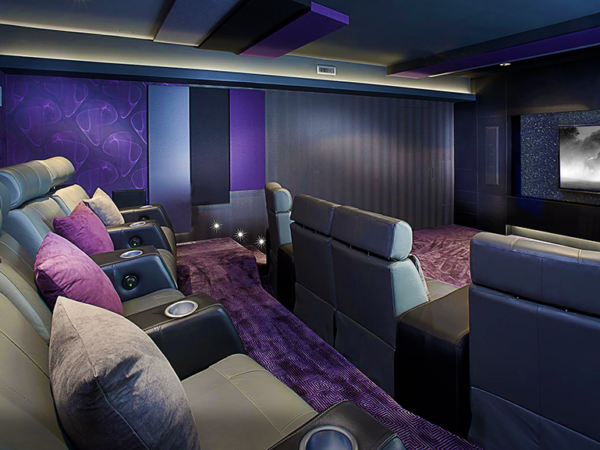 I love color, I love pattern, I love texture, and when these elements are combined in the right way, it is the ultimate choice for me. Textured coverings are my favorite. By using a thick velvet, velour, or corduroy, an entertainment space can be transformed into an entirely new atmosphere. These coverings create warmth and intimacy. They also often have acoustic properties that reduce reverberations or echoes—obviously a major consideration when designing a home theater.